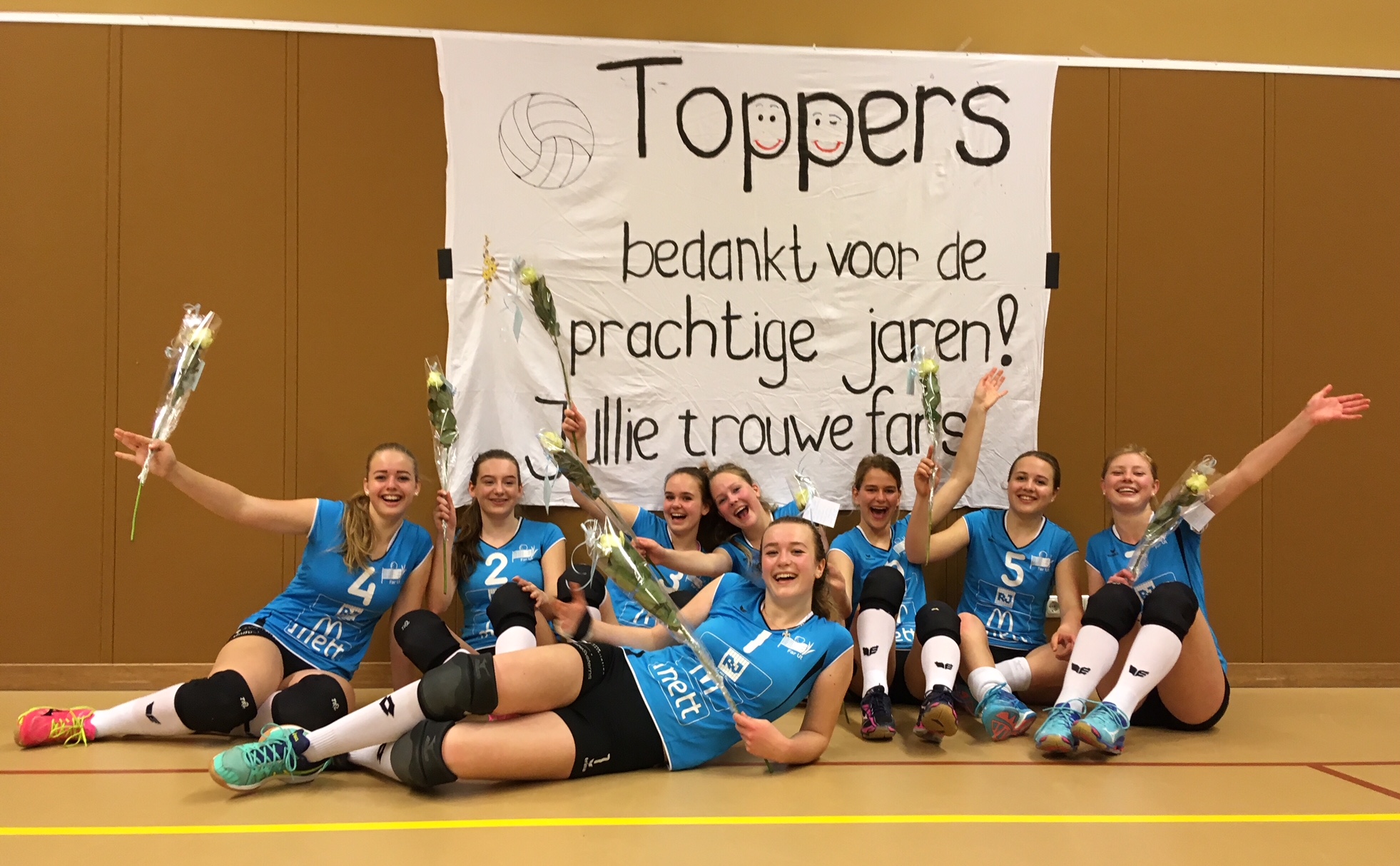 Niet voor niets prijkte er zaterdag bij de laatste wedstrijd van het seizoen een groot spandoek op de muur. ‘Toppers, bedankt voor al die prachtige jaren!’ Van de fans, en dat waren er in de loop der jaren héél wat! En terecht: want wat Janna, Margriet (later naar Sneek), Marie, Ylsa, Amber, Eline, Ilse, Annemare (later naar Sneek), Rixt, Dagmar en Hiltje in die tijd hebben laten zien, was werkelijk geweldig. Van het allereerste begin in die rode shirtjes bij het circulatievolleybal, tot via het Nederlands kampioenschap en de platte kar bij de junioren – tot in de noordelijke topklasse – het was geweldig. Dat is niet alleen op hun conto te schrijven: al die jaren was de training met Janice en Trijnilda en Karin en niet te vergeten de coaching (Janet dikke pluim!) perfect. De trainingsopkomst ook en dat zegt wat over beide kanten!